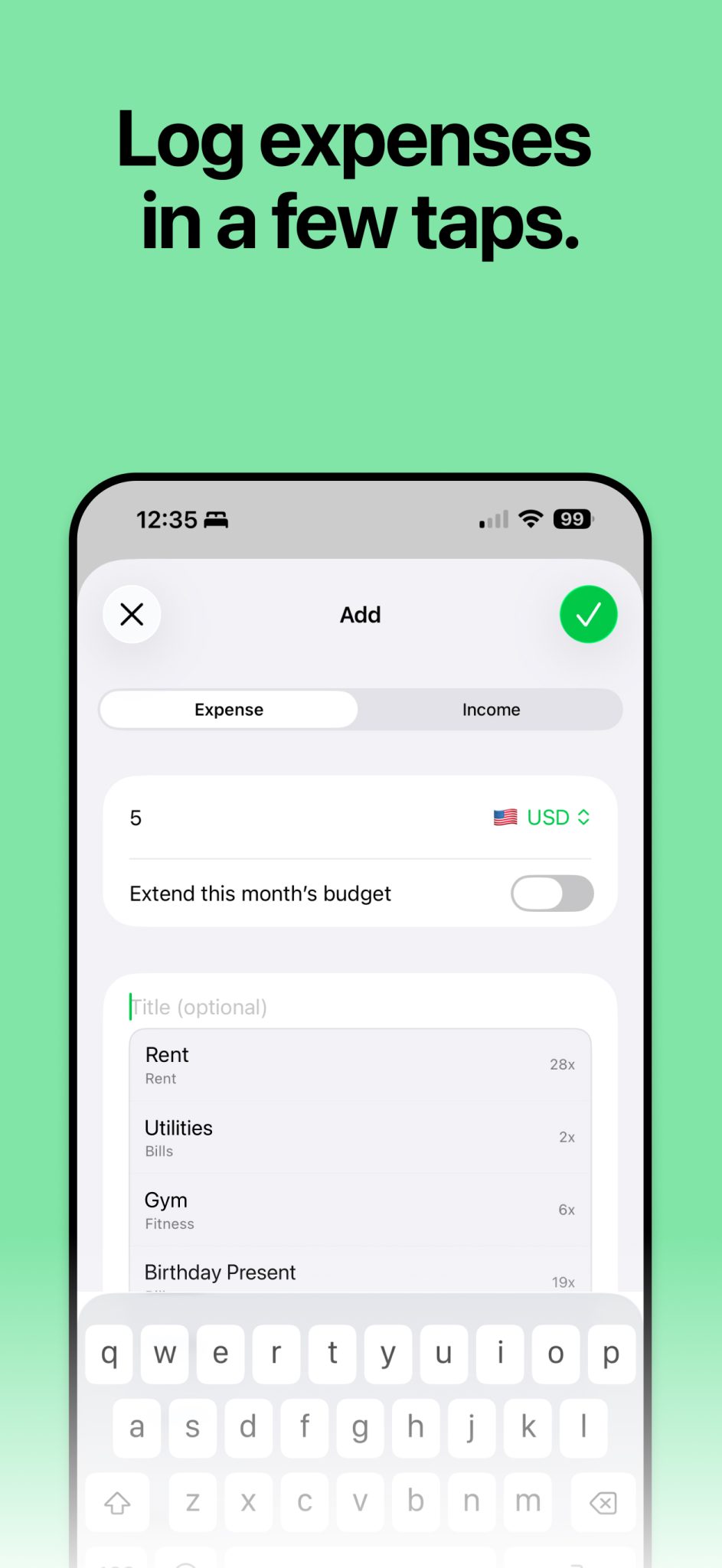 Logging an expense is intentionally fast, reducing cognitive load and making repeat use more likely.